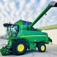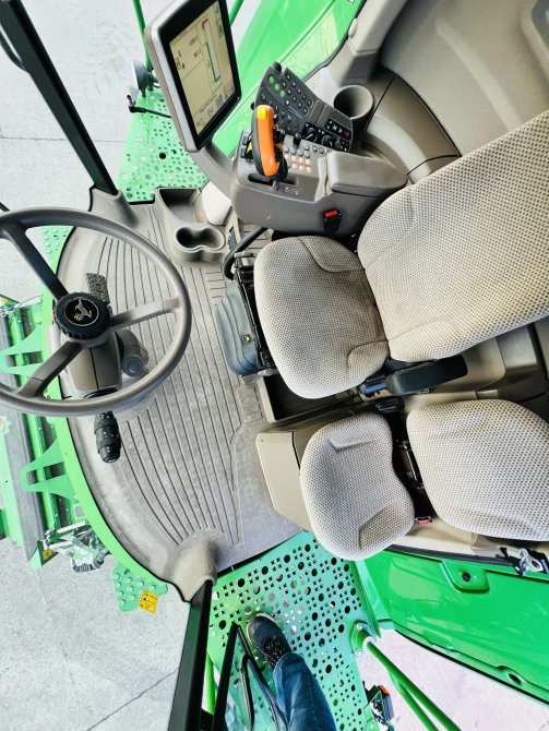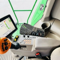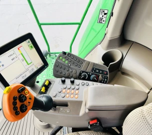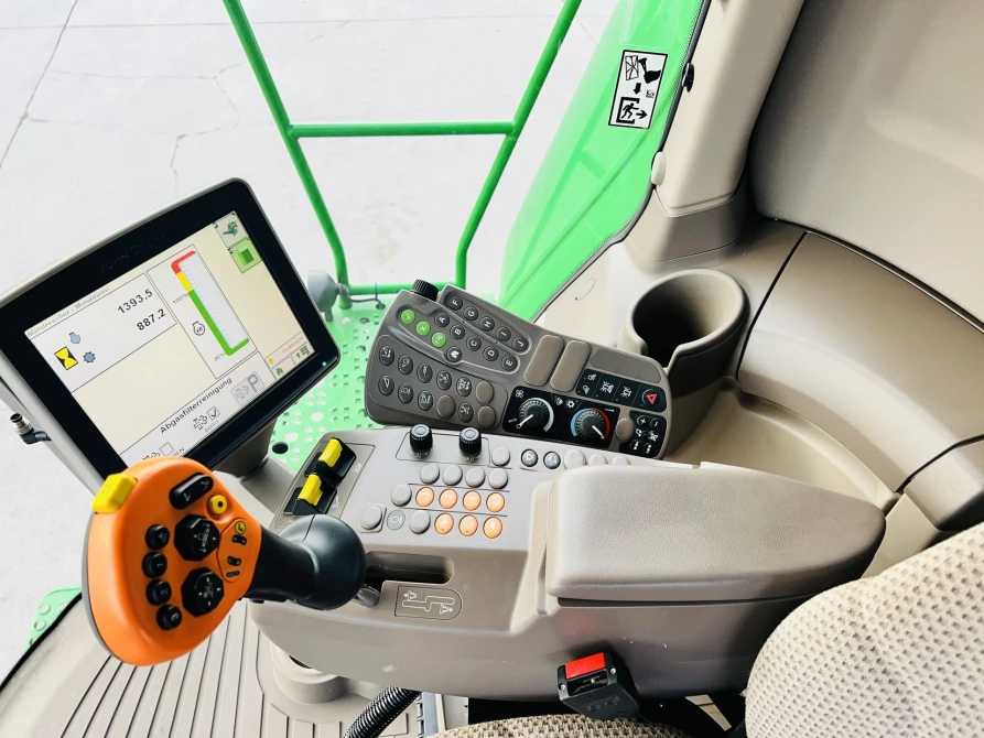 Electric 3-speed transmission 20 km/h, deluxe cab, Autotrac preparation, integrated GS3 2630 touchscreen display, HarvestMonitor, reduction gearbox, electrically adjustable sieves, 11,000-liter grain tank, extra-fine chopper, semi-automatic trailer hitch, camera package, laser sensor for reverse control, service light package, quick-swivel intensive scraper bar, PREMIUM connectivity package, deluxe seat, refrigerator with active cooling, adjustable swath former